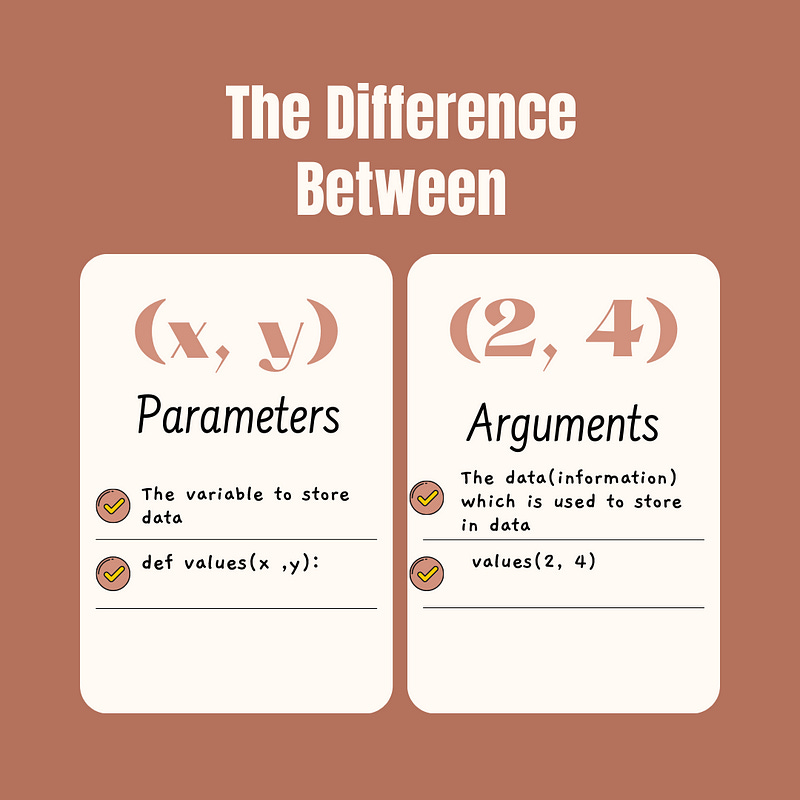 In this example, `numbers` is a parameter in the `calculate_average` function definition, while `1`, `2`, `3`, `4`, and `5` are arguments that are passed to the function when it is called. `result` and `message` are parameters in the `print_result` function definition, while `average` and `”The average is:”` are arguments that are passed to the function when it is called.